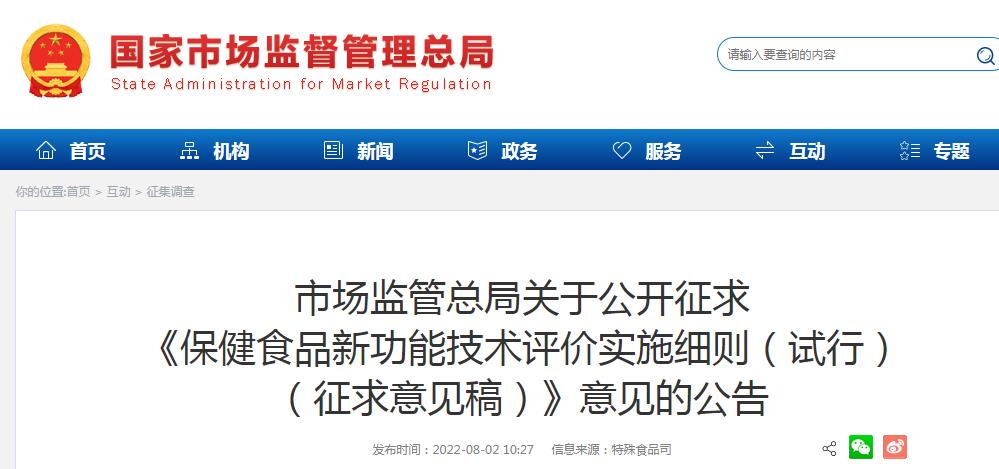 近日,市場監(jiān)管總局在門戶網(wǎng)站發(fā)布公告,公開征求《保健食品新功能技術評價實施細則(試行)(征求意見稿)》意見。 ?   據(jù)了解,市場監(jiān)管總局根據(jù)《保健食品原料目錄和保健功能目錄管理辦法》,組織制定了《保健食品新功能技術評價實施細則(試行)(征…